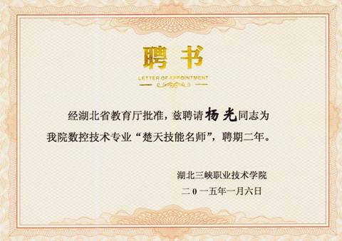 我公司楊光同志被三峽職業(yè)技術(shù)學(xué)院聘請(qǐng)為“楚天技能名師”。