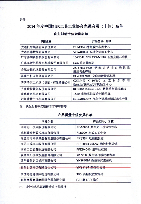 宜昌長機科技獲中國機床工具工業(yè)協(xié)會2014年度“產(chǎn)品質(zhì)量十佳會員”榮譽