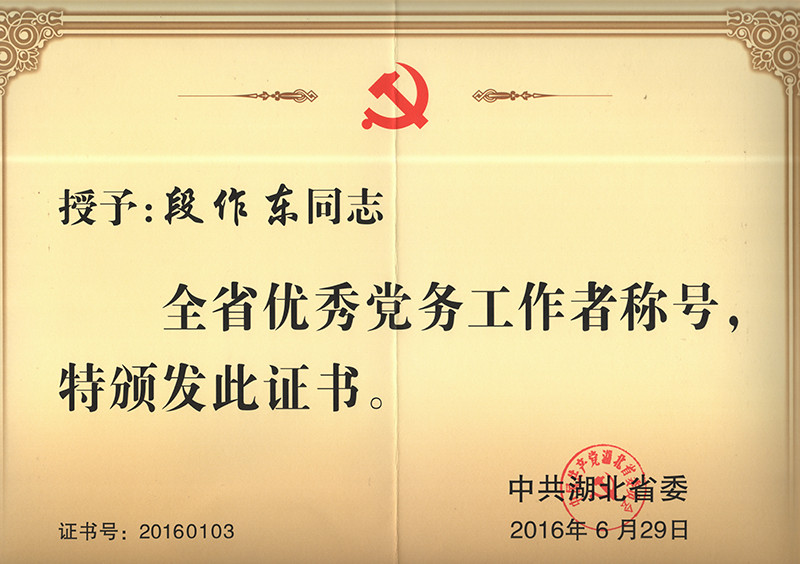 公司黨委書記段作東同志榮獲中共湖北省委授予的“全省優(yōu)秀黨務(wù)工作者”稱號(hào)。