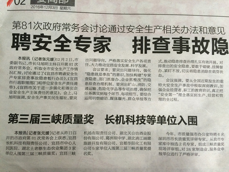 宜昌長(zhǎng)機(jī)科技有限責(zé)任公司入圍第三屆三峽質(zhì)量獎(jiǎng)。