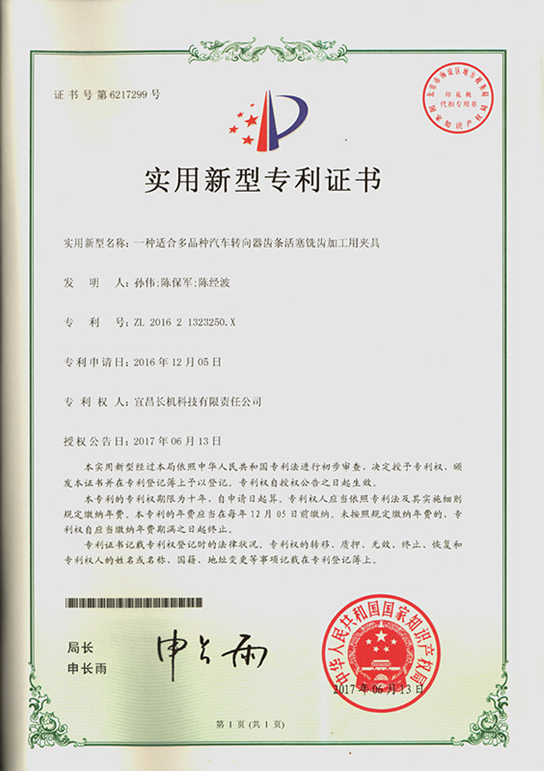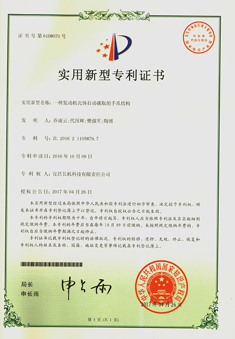 宜昌長(zhǎng)機(jī)科技公司“插齒機(jī)床身熱穩(wěn)定性結(jié)構(gòu)”、“一種發(fā)動(dòng)機(jī)殼體自動(dòng)抓取的手爪結(jié)構(gòu)”、“一種適合多品種汽車轉(zhuǎn)向器齒條活塞銑齒加工用夾具”獲實(shí)用新型專利,