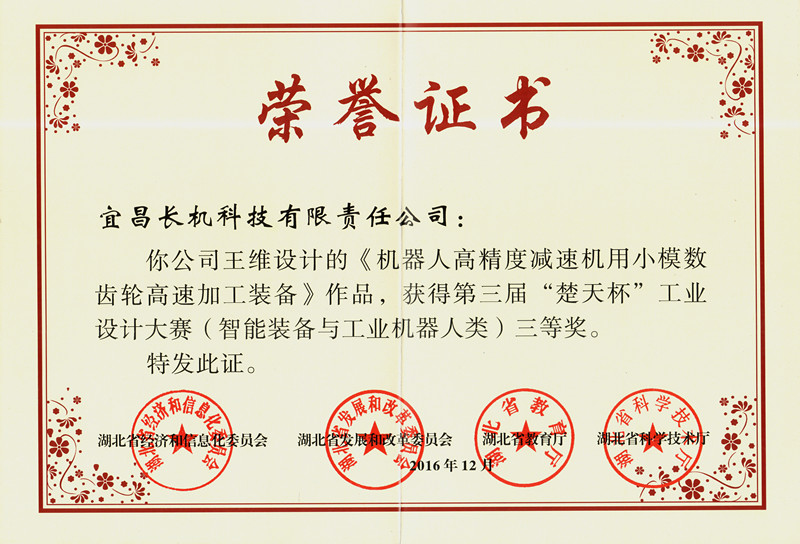 王維設計的作品“機器人高精度減速機用小模數(shù)齒輪高速加工裝備”榮獲第三屆“楚天杯”工業(yè)設計大賽三等獎。