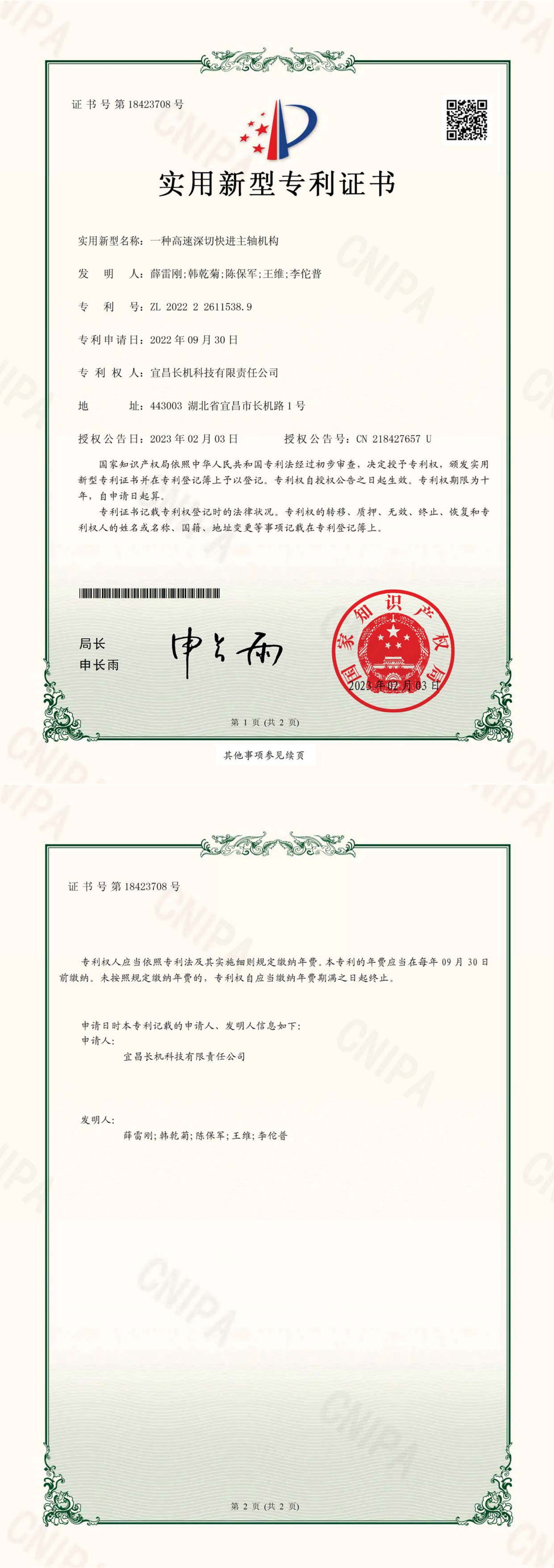 公司“一種高速深切快進(jìn)主軸機(jī)構(gòu)”榮獲實(shí)用新型專利。