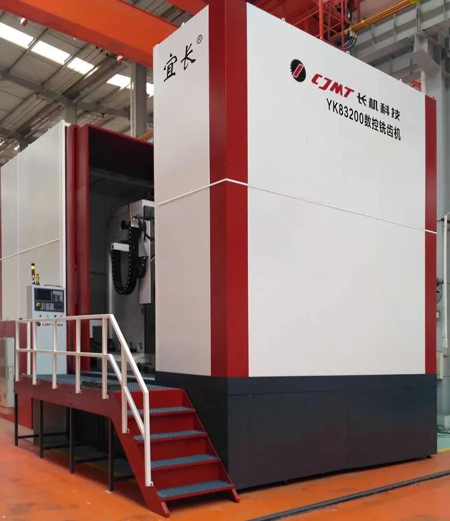 宜昌長(zhǎng)機(jī)科技有限責(zé)任公司研發(fā)的YK83200(A)數(shù)控銑齒機(jī),主要適用于風(fēng)電、工程機(jī)械、礦山機(jī)械、冶金機(jī)械等回轉(zhuǎn)支承相關(guān)行業(yè)的行星減速機(jī)、增速箱、偏航軸承內(nèi)外齒圈及變漿軸承內(nèi)齒齒廓等中大型內(nèi)外圓柱直齒輪、斜齒輪的加工。機(jī)床可滿足高效干式銑削加工,具有綠色、環(huán)保、高效、加工尺寸穩(wěn)定等特點(diǎn)。