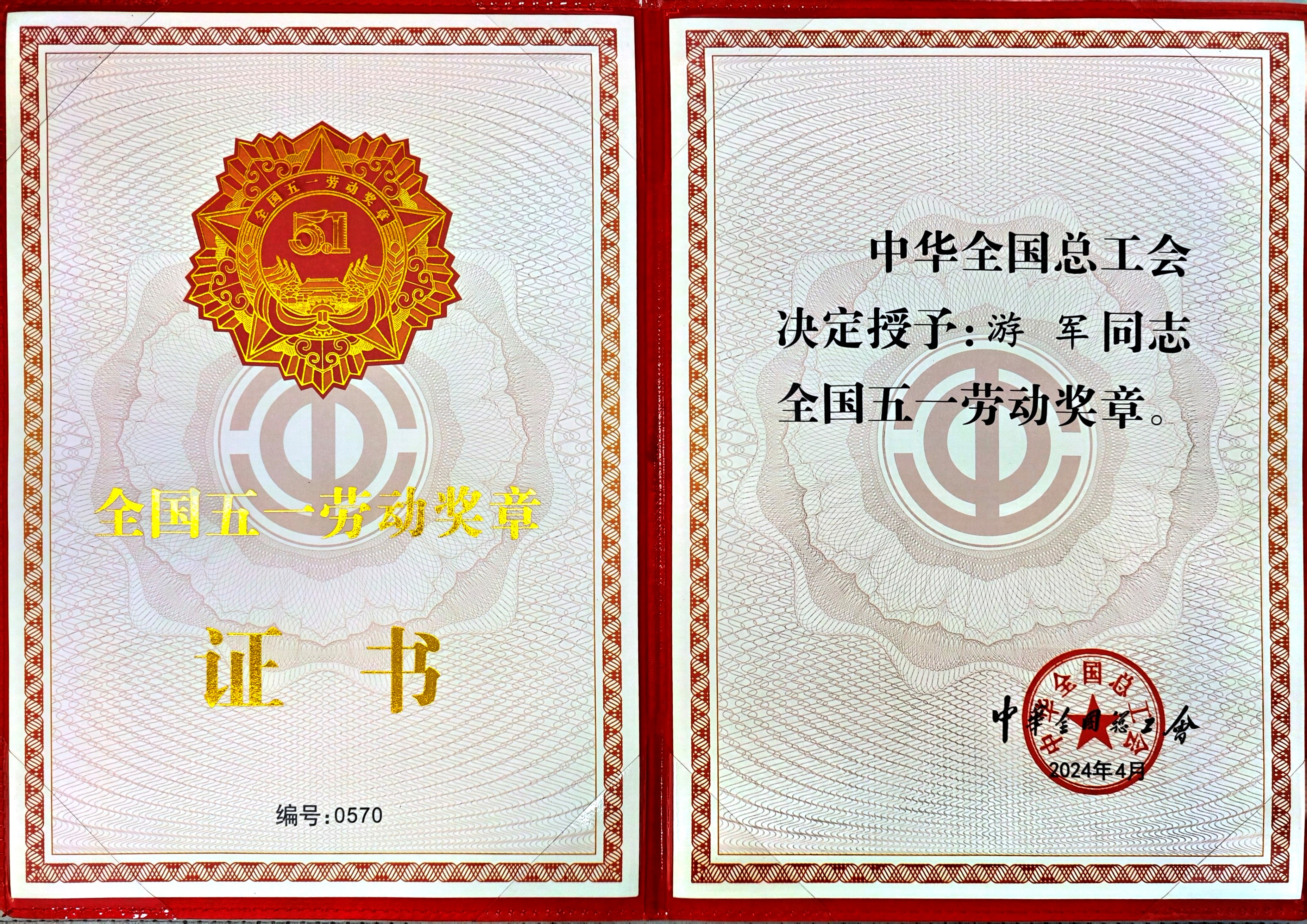 (游軍“全國五一勞動獎?wù)隆睒s譽證書)